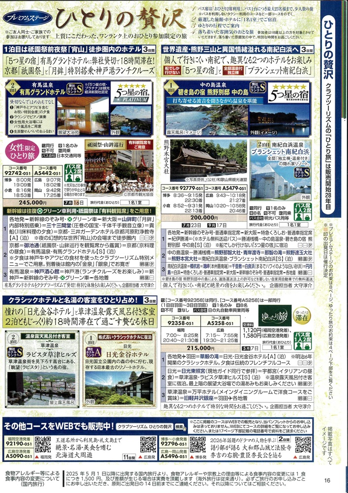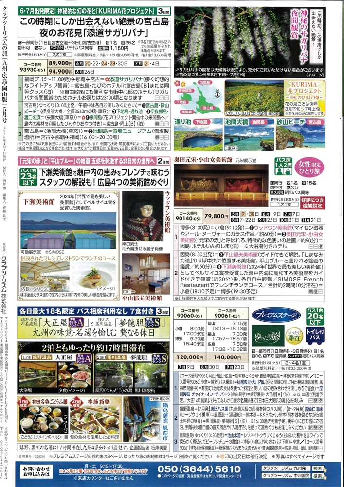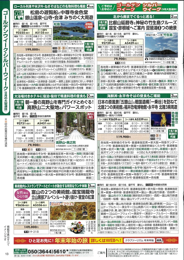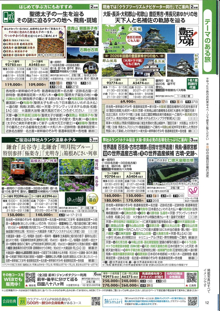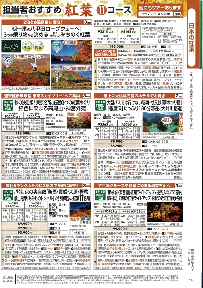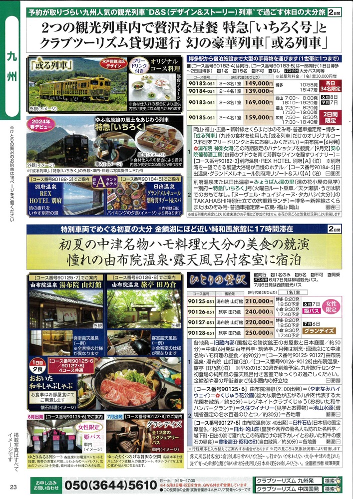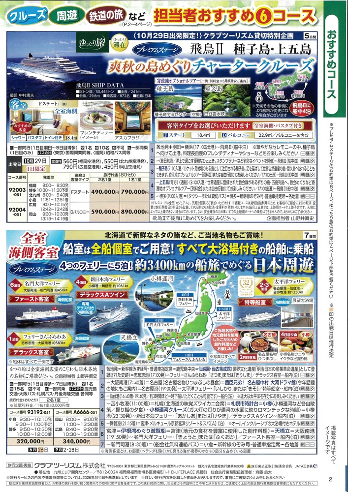 ツアー 2026/04/14 【国内】クラブツーリズムの旅 期間 2026年04月~2026年12月 出発地 九州・広島・岡山 訪問都市 国内各地 ご夫婦ひとりだけど一人じゃない旅添乗員同行 添乗員同行プランならこちら! 九州発着の添乗員同行型ツアーが掲載されています。 掲載ツアー一覧 祭り・花火 プレミアムステージ テーマのある旅 ゴーデンウィーク・シルバーウィーク 日本の紅葉 ひとりの贅沢 ひとり旅 島旅 等 その他備考 ※掲載している写真はパンフレットより抜粋しております。 対象ホテル・旅行条件等の詳細は各店舗にあるパンフレットをご覧ください。 ご不明な点は、お気軽にお問い合わせください。 その他画像